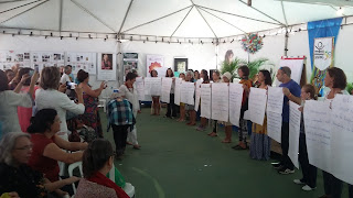 Um participante de cada grupo carregou o cartaz com a frase e todos se alinharam de frente para os participantes. Nas váris cartelas, algumas palavras se repetiram, tais como gratidão, fluidez, transparência, revelando o que se encontra na consciência de cada um.